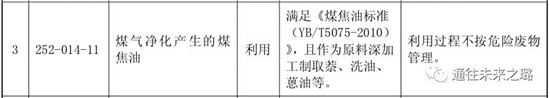 ? ? 以煤氣凈化產(chǎn)生的煤焦油為例,如果滿足《煤焦油標準(YB/T5075-2010)》,且作為原料深加工制取萘、洗油、蒽油等,利用過程就不按危險廢物管理。