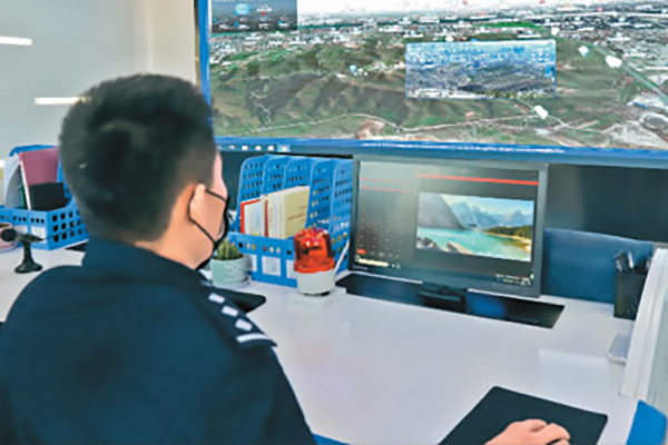 河北省張家口市經(jīng)開區(qū)森林公安局的民警正在運(yùn)用智慧森林防火和生態(tài)保護(hù)系統(tǒng)進(jìn)行森林防火監(jiān)控。畢瑞翔攝(人民圖片)