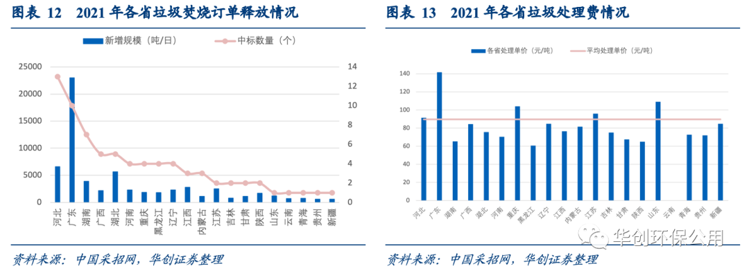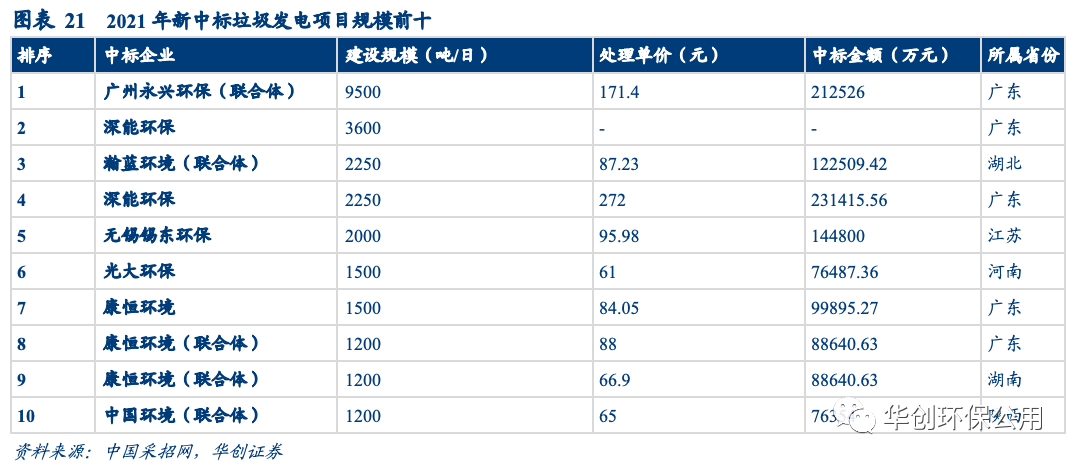 垃圾焚燒新訂單釋放速度減緩、處理費(fèi)價(jià)格提升。2021年垃圾焚燒新增體量進(jìn)一步下降,全年中標(biāo)項(xiàng)目總處理規(guī)模達(dá)6.35萬(wàn)噸/日,同比2020年下降15.67%。與此同時(shí),2021年平均中標(biāo)處理單價(jià)為89.63元/噸,同比2020年增長(zhǎng)12.73%。近三年以來(lái)中標(biāo)價(jià)一直維持快速上升態(tài)勢(shì),疊加政策推動(dòng),我們認(rèn)為未來(lái)很可能按照“產(chǎn)生者付費(fèi)”原則,實(shí)施居民處理費(fèi),健全收費(fèi)機(jī)制,垃圾處理費(fèi)單價(jià)有望進(jìn)一步提升,降低對(duì)補(bǔ)貼依賴(lài)程度。
