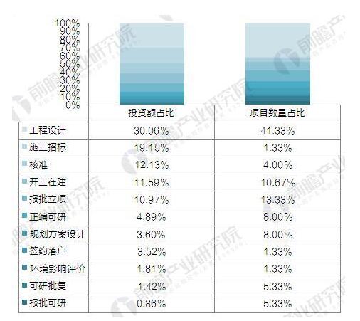 ? ? 從項目所處階段來看,工程設(shè)計階段的垃圾發(fā)電建設(shè)項目最多,共有31個、19.9億元投資額的在建、擬建項目,項目數(shù)量、投資額占比分別為41.33%、30.06%;其次是施工招標(biāo),雖然只有1個項目,但投資額達(dá)到12.68億元;處于報批立項階段的項目數(shù)量共10個,僅次于工程設(shè)計階段,投資額為7.26億元;尚無已竣工運(yùn)營的項目。
