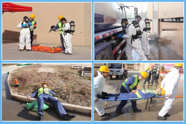 氨水泄漏持續(xù)30分鐘,其中一位巡檢人員被困于氨水罐內(nèi),未及時逃離泄漏區(qū),半路中暈倒,應(yīng)急救援組實施救援,擔(dān)架抬送至陰涼通風(fēng)處并及時送醫(yī)救治。